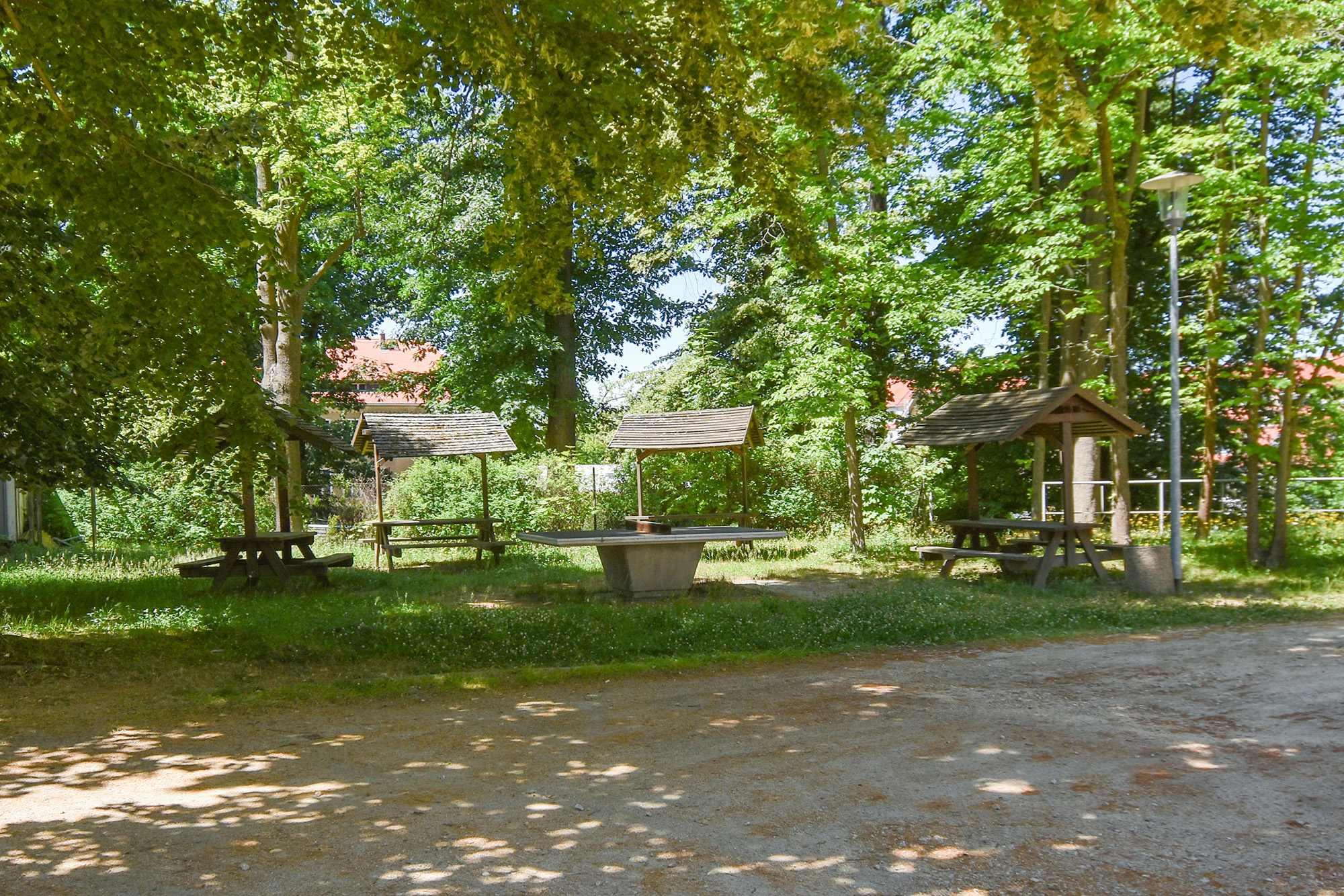 • großzügiger Park mit vielen Bäumen, Freiflächen und Wegen, Ruhebänken und Sportanlagen